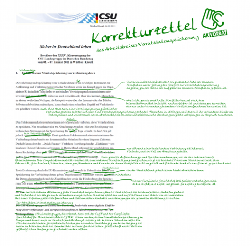 : Vorratsdatenspeicherung: Korrekturzettel für die CSU Die CSU hat letzte Woche ein aktuelles Papier mit den ganzen alten Forderungen nach mehr Überwachung und weniger Bürgerrechten beschlossen. Dazu gibt es jetzt einen Korrekturzettel vom Arbeitskreis Vorratsdatenspeicherung, um beim nächsten Mal bessere Positionen beschließen zu können. Die große Version zum Ausdrucken findet sich hier als 1,7 MB große Datei.
