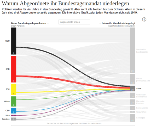 : Interaktive Grafik zeigt jeden Mandatsverzicht seit 1949 Die Berliner Morgenpost visualisiert in einer interaktiven Grafik, welche Bundestagsabgeordneten aus welchen Fraktionen seit 1949 auf ihr Mandat verzichtet haben und was die jeweiligen Gründe dafür waren. Spitzenreiter der Gründe ist ein Wechsel aus der Bundes- in die Landespolitik. Nur wenig mehr Bundestagsabgeordnete sind wegen einer Affäre gegangen (worden) als wegen einem Wechsel in die […]