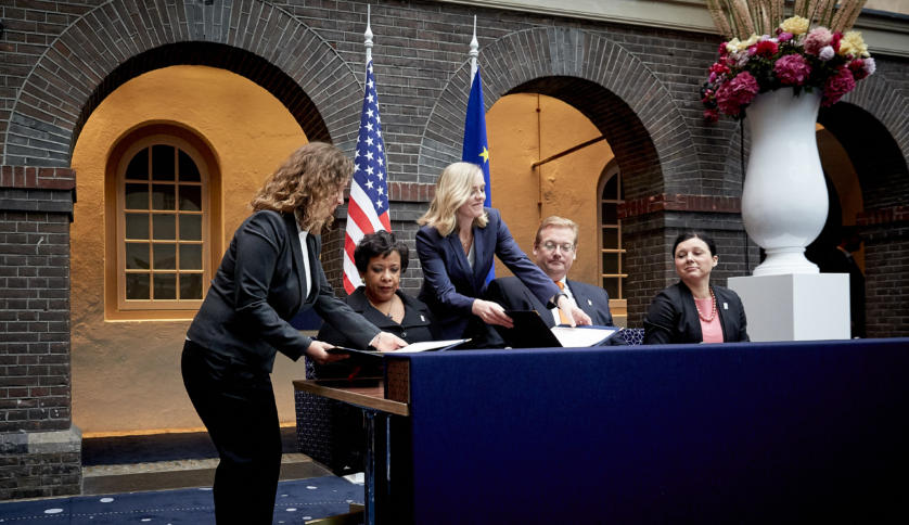 US-Justizministerin Loretta Lynch und niederländischer Justizminister van der Steur bei der Unterzeichnung des Abkommens im Juni. Bild: <a href="https://www.flickr.com/photos/eu2016nl/27314733962/in/album-72157668388984410/">EU-Kommission</a> : Innen- und Justizausschuss des Europäischen Parlaments nimmt Transatlantisches Datenschutz-Abkommen an Ermittlungsbehörden in USA und EU sollen künftig verbindliche Standards für den Austausch personenbezogener Daten bekommen. Das ist Anliegen des transatlantischen Datenschutz-Abkommens, das heute vom Innenausschuss des Europaparlaments angenommen wurde. Schon nächste Woche soll das Parlament das bereits unterzeichnete Abkommen ratifizieren.