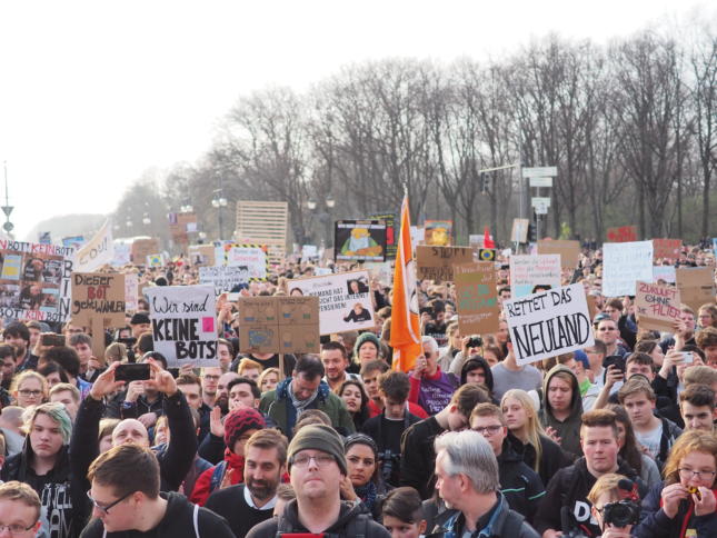 Demonstrierende auf der Demo am 23. März in Berlin. : Die Protestbewegung hat gewonnen Trotz der Niederlage im EU-Parlament wächst jetzt eine neue Generation von Menschen heran, die gemerkt hat, dass Brüssel der Hebel ist, um Politik zu ändern und mitzugestalten. Das ist der Erfolg der Protestbewegung für ein freies Internet. Ein Kommentar.
