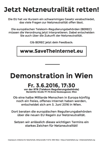 : Diesen Freitag: Auf zur Demonstration für Netzneutralität in Wien! Am 3. Juni soll eine Demonstration in Wien dazu beitragen, die Netzneutralität in Europa zu erhalten. Nur durch öffentlichen Druck können wir erreichen, dass die europäischen Regulierer auf die Zivilgesellschaft hören.