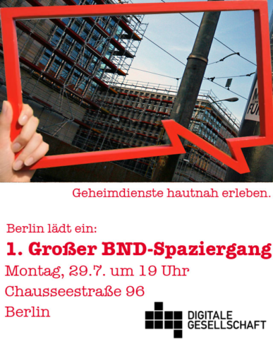 : No Risk, No Fun – Geheimdienste hautnah erleben. 1. Großer BND-Spaziergang am 29.7. Ich habe für Montag eine Demonstration beim Bundesnachrichtendienst in Berlin angemeldet. Und das ist der Aufruf: No Risk, No Fun – Geheimdienste hautnah erleben. 1. Großer BND-Spaziergang am 29.7. um 19 Uhr Im Sommer zeigt sich Berlin von der schönsten Seite. Und mitten in Berlin baut der Bundesnachrichtendienst BND seine neue Zentrale auf. Berlin ist […]