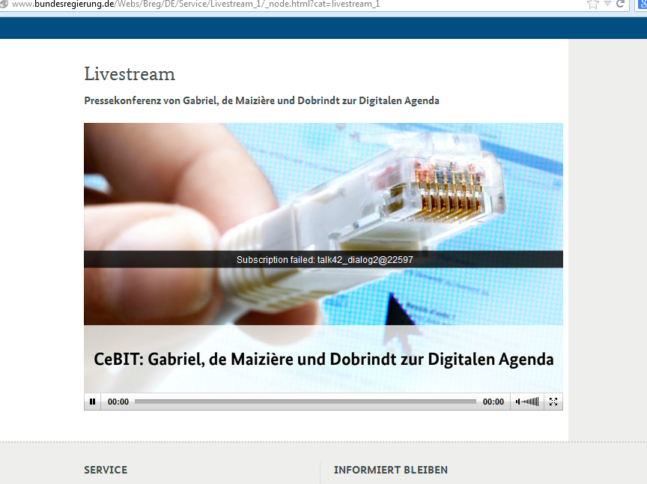 : #DigitaleAgendaDE: Subscription failed Unsere drei für die Digitale Agenda zuständigen Minister, Sigmar Gabriel (BMWi), Alexander Dobrindt (BMVI) und Thomas de Maiziere (BMI) wollten heute auf der Cebit in Hannover im Rahmen einer Pressekonferenz im Namen der Bundesregierung die Handlungsfelder der Digtialen Agenda vorstellen. Dabei wurden vor allem zwei Aspekte in den Vordergrund gestellt: Die Digitale Agenda kommt später […]