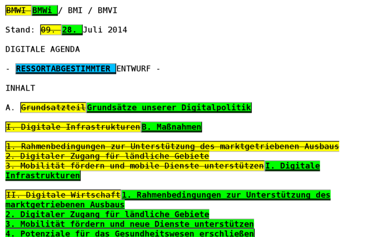 : Digitale Agenda der Bundesregierung: Was die Ministerien in den letzten drei Wochen geändert haben Dies ist ein schnell zusammengehackter Diff zwischen der alten und neuen Version der Digitalen Agenda. (Manche Typos können auch an uns liegen, da wir die erste Version per OCR erst in Text umwandeln mussten.) Legende: unverändert im alten Dokument anders im neuen Dokument anders hinzugefügt entfernt Erwähnenswerte Änderungen können gerne in den Komentaren gepostet werden. […]