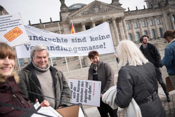 Digitalcourage demonstrierte am Donnerstag vor dem Bundestag und warnte vor der Reform als „Ausverkauf des Datenschutzes“. Foto: CC-BY-4.0, Digitalcourage. : Der Bundestag berät Datenschutzreform: „Datenschätze heben, analysieren, veredeln“ Am Donnerstagabend beriet der Bundestag eine Anpassung des EU-Datenschutzrechts an die deutsche Gesetzgebung. Unionspolitiker forderten eine wirtschaftsfreundliche Umsetzung, die Opposition kritisierte eine Verwässerung und die im Gesetz fehlende datenschutzrechtliche Kontrolle der Geheimdienste.