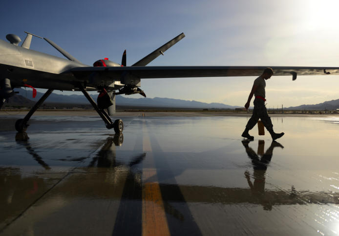 Kampfdrohne MQ-9 Reaper vor dem Start in der Creech Air Force Base in Nevada, USA. : Menschenrechtler fordern Ende der Aufweichung des Völkerrechts bei Kampfdrohnen In einer völkerrechtlichen Analyse fordern Menschenrechtler die Bundesregierung auf, zu einer engen Auslegung des Völkerrechts zurückzukehren und Unterstützungshandlungen für US-Drohnenangriffe einzustellen. Für die Bundeswehr sollen keine Kampfdrohnen angeschafft werden, ohne völkerrechtliche Fragen vorher neu zu bewerten.