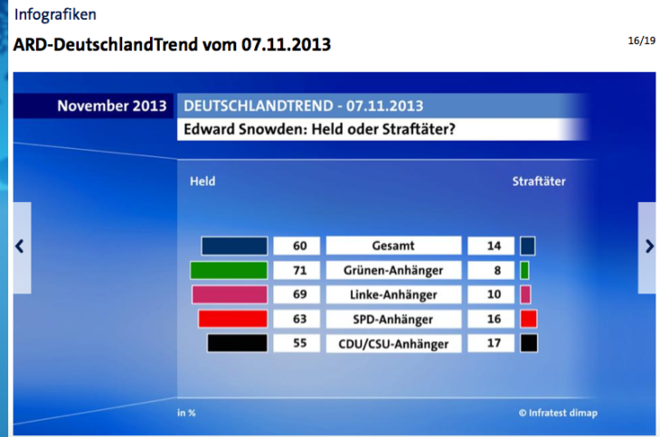 : Gesellschaftliche Mehrheit findet: Edward Snowden ist ein Held! Edward Snowden ist der größte Held, den die netzpolitische Community bisher gesehen hat. Dass er ein Held und kein Straftäter ist, findet mittlerweile auch eine gesellschaftliche Mehrheit von 60%. Der Rest liest wahrscheinlich Bild oder hat ein schlechtes Namensgedächtnis. Dieses Ergebnis hat die ARD im Rahmen ihres Deutschlandtrends berichtet. Selbst unter CDU-/CSU-Wählern sieht eine Mehrheit […]