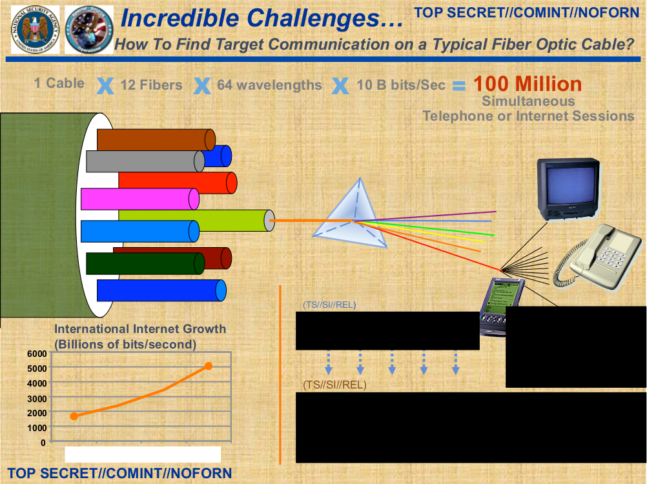Schon vor fünf Jahren waren "100 Millionen Internet-Verbindungen" in einer Glasfaser. Folie: NSA. Informationsfreiheits-Ablehnung des Tages: „Geheimdienste fallen gar nicht unter Informationsfreiheitsgesetz“ Der Bundesnachrichtendienst will uns nicht sagen, wie er zusammen mit der NSA massenhaft Glasfaser-Kabel abhört. Unsere Informationsfreiheits-Anfrage wurde abgelehnt, weil der Geheimdienst gar nicht darunter falle. Weitere Details zu dem Programm „RAMPART“ liefert das Buch „Der NSA-Komplex“.