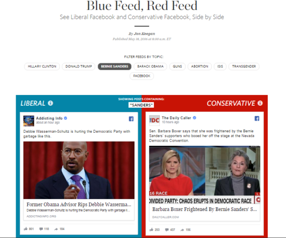 Screenshot des "Blue Feed, Red Feed" Tools der Washington Post : Neues Tool zeigt konservative und liberale Filterbubbles bei Facebook Facebook wird immer mehr zur primären Informationsquelle für seine fast 1,7 Milliarden Nutzer. Sei es Sport, Klatsch und Tratsch oder Politik – viele Nutzer erfahren Neues vorwiegend über den Facebook Newsfeed. Ein Tool des Wall Street Journals zeigt, wie unterschiedlich liberale und konservative Filterbubbles in den USA aussehen.