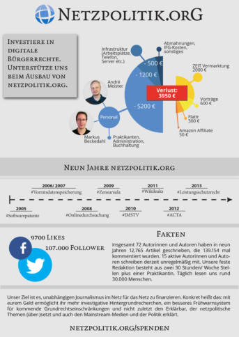 : Debatte: Wie kann sich Onlinejournalismus finanzieren? Gestern haben wir eine kleine Crowdfinanzierungs-Kampagne gestartet. Nach der Offenlegung unserer Finanzen ist deutlich geworden, dass netzpolitik.org viel mehr Geld verbraucht als bisher eingenommen wird. Wir hatten im Februar bereits unsere Finanzierung transparent gemacht. Damals sah es noch besser aus, weil wir einen mittelständischen Sponsor hatten, der bei uns über zwei Jahre Werbung gebucht hatte, […]