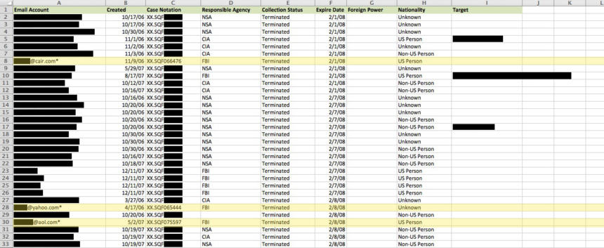 Ein Auszug aus der Tabelle, auf die sich Greenwald und Hussein beziehen. Die markierten Einträge sind die Email-Adressen von Nihad Awad (cair.com) und Faisal Gill (Yahoo! und AOL). : Neues Snowden-Dokument ausgewertet: NSA und FBI überwachen gezielt US-amerikanische Muslime Die NSA und das FBI haben prominente muslimische US-Amerikaner heimlich überwacht. Unter den Betroffenen befinden sich Anwälte, Aktivisten und Wissenschaftler, die allesamt US-Staatsbürger sind oder eine dauerhafte Aufenthaltsgenehmigung haben. Das geht aus Dokumenten des NSA-Whistleblowers Edward Snowden hervor, die Glenn Greenwald und Murtaza Hussain auf The Intercept veröffentlicht haben. Auf der Liste finden sich unter […]