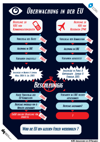 Infografik: EDRi.org und Accessnow. Lizenz: <a href="https://creativecommons.org/licenses/by/3.0/">CC BY 3.0</a> : Abstimmung zu Vorratsdatenspeicherung von Fluggastdaten im Live-Stream Heute tagt im EU-Parlament der Ausschuss für bürgerliche Freiheiten, Justiz und Inneres (LIBE), um über die geplante Richtlinie zur Fluggastdatenspeicherung (Passenger Name Records, PNR) abzustimmen. Die Sitzung beginnt um 15 Uhr und wird live im Internet übertragen. Die Richtlinie sieht vor, dass bis zu 60 Einzeldaten jedes Passagiers gespeichert werden, vom Namen bis hin zu […]