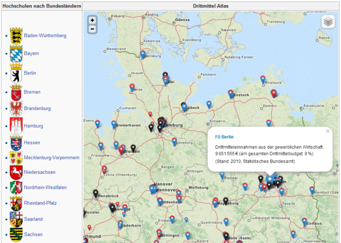 : Portal „Hochschulwatch“ für Unabhängigkeit der Forschung gestartet Die taz, Transparency International Deutschland e.V. und der fzs (freier zusammenschluss von studentInnenschaften) haben heute das Projekt „Hochschulwatch. MachtWirtschaftUni“ offiziell gestartet. Ziel ist es laut Pressemeldung fragwürdige Kooperationen und Fälle von Einflussnahme wirtschaftlicher Akteure auf universitäre Forschung und Lehre zu sammeln und sichtbar zu machen. Zu diesem Zweck gibt es eine „Drittmittel-Atlas“ getaufte Karte auf Basis […]