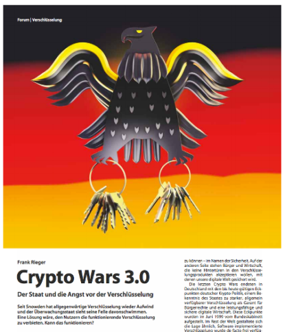 : Frank Rieger über „Crypto Wars 3.0“ Frank Rieger hat in der aktuellen Ausgabe der c’t den lesenswerten Beitrag „Crypto Wars 3.0: Der Staat und die Angst vor der Verschlüsselung“ beigesteuert. Darin skizziert er, wie Geheimdienste in der Vergangenheit bemüht waren, Verschlüsselungstechnologien gezielt zu unterwandern, und es ihnen dennoch gelang, dem Nutzer ein Gefühl von Sicherheit zu vermitteln. Seit den Snowden-Enthüllungen und […]