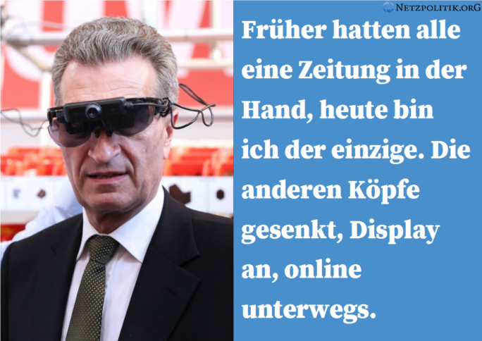 : Günther Oettinger: „Früher hatten alle eine Zeitung in der Hand, heute bin ich der einzige.“ Unser EU-Digitalkommissar Günther Oettinger beschwert sich über den Medienwandel: „Früher hatten alle eine Zeitung in der Hand, heute bin ich der einzige. Die anderen Köpfe gesenkt, Display an, online unterwegs. Viele sind dabei ja offline, weil es zu viele Funklöcher bei uns gibt. Aber das ist eine andere Geschichte. Das alles und noch viel mehr, […]