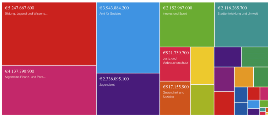 Der Berliner Haushaltsplan 2017. Screenshot: Berlin.de : Berlin visualisiert seine Haushaltspläne Das Land Berlin hat mit Unterstützung der Open Knowledge Foundation seine Haushaltspläne visualisiert und stellt diese auf der landeseigenen Webseite zur Verfügung. Dank der Visualisierung ist sehr einfach zu erkennen, wie groß welche Posten ausfallen, auch im Verhältnis zueinander. Die Visualisierung beruht auf der Software Open Spending.