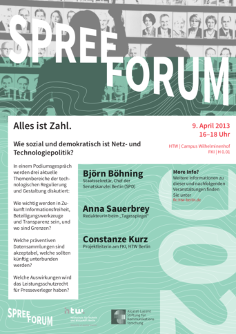 : Dienstag in Berlin: Alles ist Zahl – Wie sozial und demokratisch ist Netz- und Technologiepolitik? Am Dienstag den 9. April 2013 wird in Berlin-Oberschöneweide das Forschungs- und Weiterbildungszentrum Kultur und Informatik an der Hochschule für Technik und Wirtschaft Berlin eröffnet. Wissenschaftliche Projektleiterin ist Constanze Kurz, Informatikerin, Sachbuchautorin und Sprecherin des Chaos Computer Club. Ab 13 Uhr ist feierliche Eröffnung mit Grußwort, Besichtigung und Get Together, und ab 16 Uhr findet […]