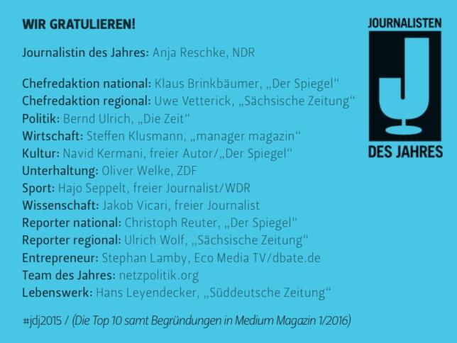 : Wir sind „Team des Jahres“ bei den „Journalisten des Jahres 2015“ Wir sind von der Jury des „medium magazin“ bei der Wahl zu den „Journalistin des Jahres“ 2015 als „Team des Jahres“ gewählt worden. Die Kurzbegründung ist: „Plötzlich berühmt – dank ‚Landesverrat’-Affäre: Wie sie diesen Kampf für eine gesamtgesellschaftliche Debatte über Pressefreiheit und Datenschutz genutzt und die ganze Journalisten-Branche zur Solidarität mit den Bloggern gebracht haben: […]