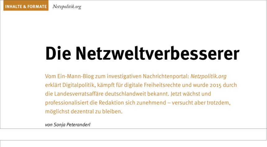 : Portrait über uns im journalist: Die Netzweltverbesserer In der Oktober-Ausgabe des Medienmagazin journalist hat Sonja Peteranderl unsere Redaktion und die Entwicklung der vergangenen Jahre seit #Landesverrat porträtiert. Mit freundlicher Unterstützung von Autorin und Verlag veröffentlichen wir das Portrait über uns.
