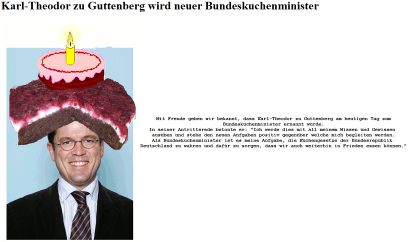 : Zu Guttenbergs Homepage gehackt Offenbar in Bezug auf die in der Netzgemeinde umstrittene Tortung Karl Theodor zu Guttenbergs am vergangenen Donnerstag wurde am Sonntagmorgen die Homepage des Ex-Wirtschafts- und Verteidigungsminister verunstaltet. So erklärt sich der designierte Berater der EU-Kommisarin für die digitale Agenda Neelie Kroes zum neuen Bundeskuchenminister. Der im Quelltext der gehacketen Seite als Urheber genannte IT-Sicherheitexperte Stefan […]