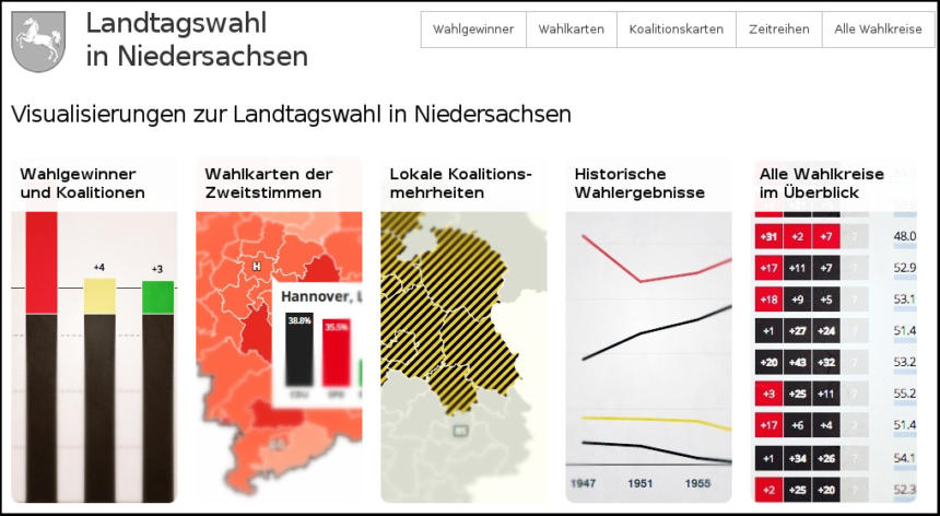 : Datenvisualisierungen zu den Wahlergebnissen in Niedersachsen Der ‚Visualisierungs-Architekt’ Gregor Aisch hat unter http://nds2013.vis4.net/ basierend auf der 18 Uhr-Prognose von Wahlrecht.de interaktive Karten und Grafiken der Wahlergebnisse aus Niedersachsen erstellt – unter anderem zu den Wahlgewinnern, möglichen Koalitionen und den Ergebnissen einzelner Wahlkreise.