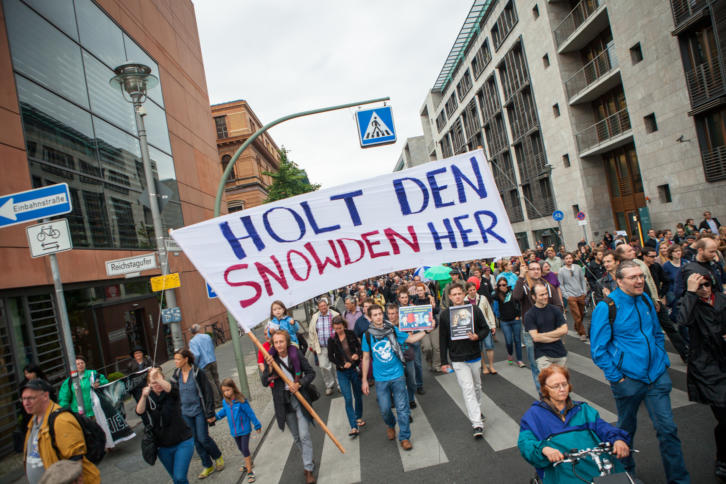 Demonstranten fordern im August 2014 auf der "Freiheit statt Angst"-Demonstration den NSA-Whistleblower Edward Snowden nach Deutschland zu holen. Bild: <a href="https://www.flickr.com/photos/campact/14897868538/in/photolist-oGttho-oYGmMF-oYGbrk-oYXEtg-hDy32N-oGtzMB-oGwc6v-oGtaHs-oGtrfh-hDyoTf-hDv6Ha-oGwSpP-nGAade-hDxKN4-nqoPa5-nJEyVB-nqoRC1-oGsQma-hDwtE2-nqoCfQ-oGt32L-fhYLPr-hDzaTp-oWZ8bA-oGwrou-oYXFAX-oYZaqQ-hDw35K-hDN5Ez-oYXDEn-hDNhso-hDNpcW-nqoAmD-nGRf8Y-nGT8Xi-hDNbeF-oYZ89A-hDv4fz-hDNHqh-hDvjaW-nqoQeE-nGTgRV-hDPye8-hDuGWD-nGFtPo-hDuYdF-nqoLgD-nGPU7C-oYGe3H-nqoNLj">Jakob Huber/Campact</a> unter <a href="https://creativecommons.org/licenses/by-nc/2.0/">CC BY-NC 2.0-Lizenz</a> : Snowden-Vernehmung im NSA-Untersuchungsausschuss: Opposition geht vor den Bundesgerichtshof Seit Einsetzung des NSA-Untersuchungsausschusses wird um die Art und Weise der Vernehmung von Edward Snowden gerungen. Da sich Große Koalition und Bundesregierung weigern, eine Befragung von Snowden in Deutschland voranzubringen, gehen Grüne und Linke nun vor den Bundesgerichtshof.