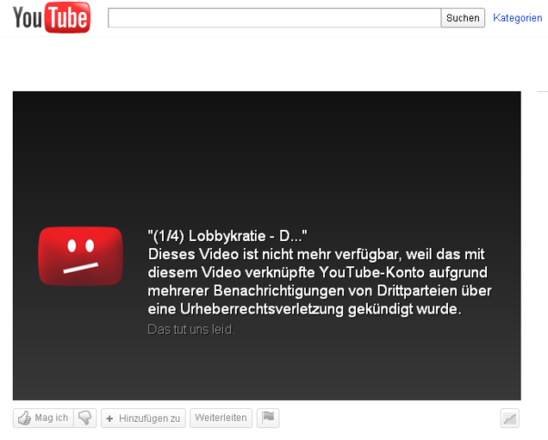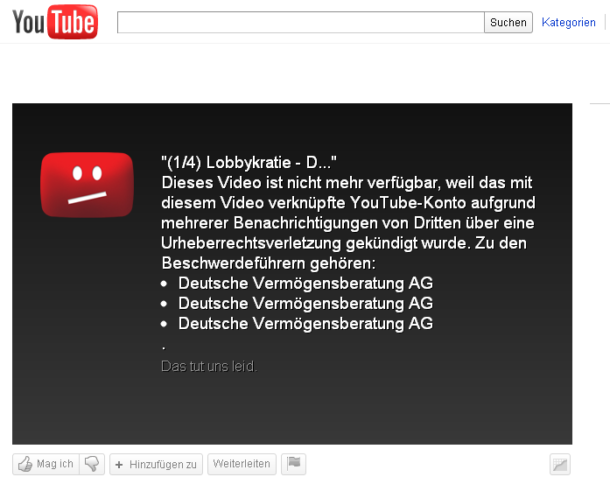: Lobbykratie und Urheberrecht, 2. Runde [Update] Anlässlich der Vergabe des Negativpreises „Lobbykratie-Medaille“ durch LobbyControl hat sich herausgestellt, dass eines der nominierten Unternehmen, die Deutsche Vermögensberatung AG, auf YouTube die Sperrung einer 3sat-Dokumentation mit dem Titel „Lobbykratie – die inoffizielle Macht“ veranlasst hatte (vgl. Abstimmung über Lobbykratie-Medaille und das Urheberrecht). Diesen Umstand haben wir mit folgendem Screenshot dokumentiert: Dieser Blogeintrag dürfte nun […]