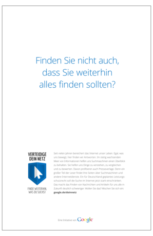 : Google startet Kampagne gegen das Leistungsschutzrecht Google Deutschland startet mit einer eigenen Kampagne „Verteidige Dein Netz“ gegen das geplante Leistungsschutzrecht für Presseverlage. Momentan besteht die Kampagne aus einem Video, „10 Fakten zum Leistungsschutzrecht“ (aus Googles-Sicht), einer „Finde Deinen Bundestagsabgeordneten-App“ und der Möglichkeit sich für einen Newsletter einzutragen, um auf dem laufenden zu bleiben. Die Vorgehensweise ähnelt der bei SOPA/PIPA in den […]