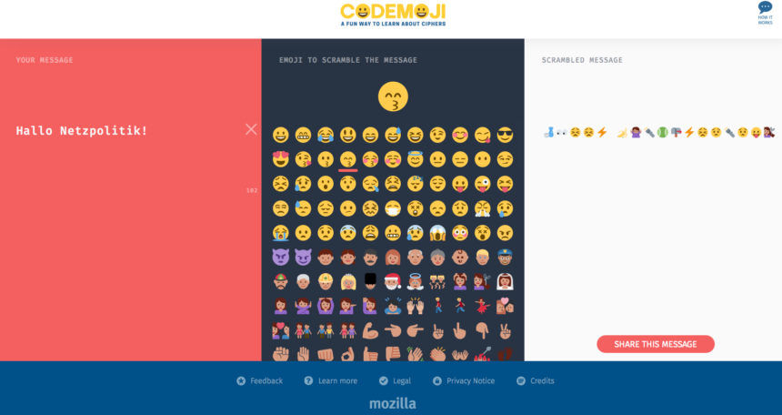 : Verschlüsseln lernen mit Emojis Codeemoji ist eine neue Mozilla-Plattform, auf der man spielerisch mit Hilfe von Emojis die Funktionsweise von Verschlüsselung lernen kann. Meine verschlüsselte Nachricht kann man mit dem richtigen Emoji hier entschlüsseln. Update: Das Entschlüsseln funktioniert nicht mehr, weil Zeitraum abgelaufen.