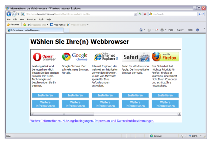 : Freie (Browser)wahl im Netz Die EU-Kommission hat im Dezember in einem Kompromissverfahren mit Microsoft eine Browser-Wahl durchgesetzt, die demnächst in Deutschland starten wird. Alle Windows-Nutzer, die den Internet-Explorer als vorkonfigurierten Browser nutzen, werden demnächst einen solchen Screen vorfinden: Die Idee dahinter ist, dass man vor die Wahl gestellt wird und sich für einen anderen Browser als den Internet Explorer […]