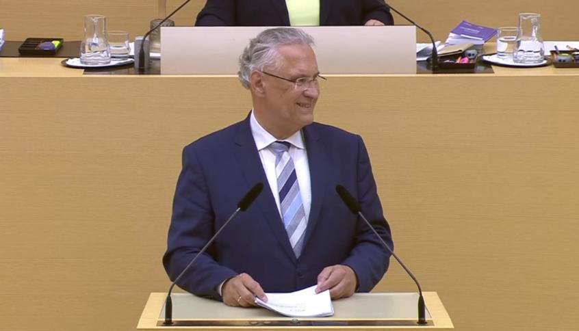 Joachim Herrmann (CSU), Innenminister in Bayern, bei der gestrigen Landtagssitzung. : Die CSU setzt ihr neues Polizeigesetz in Bayern durch Die CSU hat ihr Polizeiaufgabengesetz gestern spätabends im Alleingang beschlossen. Die Opposition stimmte geschlossen dagegen. Zuvor waren bei der größten Demonstration seit Jahren 40.000 Menschen gegen die Ausweitung der polizeilichen Befugnisse in München auf die Straße gegangen. Ein Bericht aus Bayern.