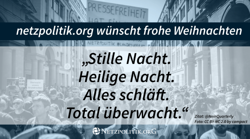 campact via <a href="https://www.flickr.com/photos/campact/20015040089/">flickr</a> (<a href="https://creativecommons.org/licenses/by-nc/2.0/">CC BY-NC 2.0</a>) : #netzrückblick: „Ein Katastrophenjahr?“ Der Podcast aus der netzpolitik-Redaktion Im #netzrückblick-Podcast lässt die als „Team des Jahres“ ausgezeichnete netzpolitik.org-Redaktion heute die wichtigsten Themen des Jahres Revue passieren. Das ist gleichsam auch unser kleines akustisches Weihnachtsgeschenk an Euch, denn morgen machen wir auch mal Pause. Statt eines Jahresrückblicks in Buchform gibt es dieses Jahr jeden Tag im Dezember einen Artikel als Rückblick auf die netzpolitischen […]