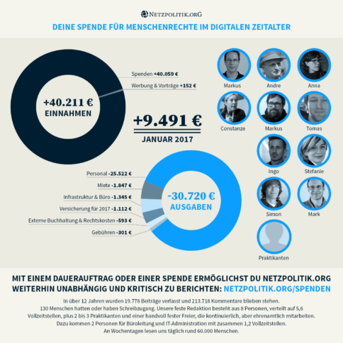 : Transparenzbericht: Unser Jahr 2016 in Zahlen Wir legen Zahlen und Statistiken des vergangenen Jahres offen. netzpolitik.org hat mehr Leserinnen und Leser als je zuvor, aber im Jahr 2016 trotzdem Minus gemacht. Die aktuelle Spendenentwicklung gibt uns aber Hoffnung, dass wir dieses Jahr zulegen können.
