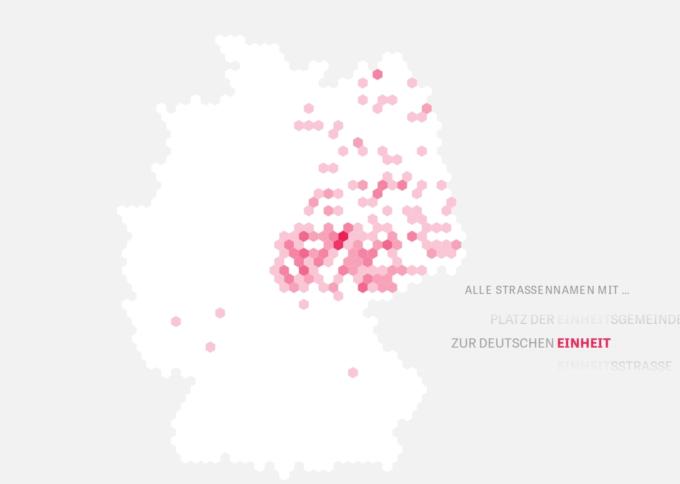 Straßen und Plätze, die der Einheit gewidmet sind, finden sich vor allem in den neuen Bundesländern. Eigentlich erinnern sie an eine <a href="https://de.wikipedia.org/wiki/Sozialistische_Einheitspartei_Deutschlands#Gr%C3%BCndung_durch_Zwangsvereinigung_von_SPD_und_KPD">andere Vereinigung</a>, als man heute denken mag. : Datenjournalismus: Zeit Online zeigt Muster in deutschen Straßennamen Zeit Online untersucht, welche Muster sich in deutschen Straßennamen erkennen lassen. In einem lesenswerten Artikel hat die Online-Redaktion historische und regionale Phänomene identifiziert, die sich in den Straßennamen widerspiegeln. Die Analyse wurde durch eine eigenständig programmierte, durchsuchbare Datenbank ermöglicht, die 450.000 Straßennamen umfasst. Grundlage des Projekts ist die freie OpenStreetMap, aus welcher der Karlsruher Dienstleister […]