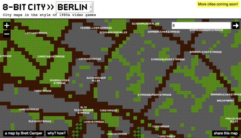 : OpenStreetMap in 8Bit Hier kann man sich die OpenStreetMap-Daten als 8Bit-Layer anschauen. Das fühlt sich dann etwas 80er-mäßig an und man sieht sich fast schon im Ultima-Dungeon. Bisher gibt es dort nur einige Städte, wovon eine Berlin ist. (Danke an Antischokke)