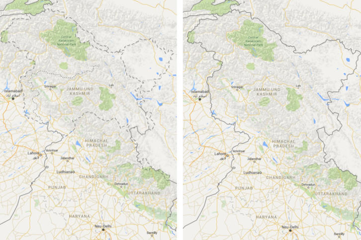 Google Maps wird in Indien ohne Grenzstreitigkeiten angezeigt (rechts). Karte: Google Maps : Indien: Umstrittener Gesetzentwurf zu Geodaten und Online-Karten vorgelegt Wegen einer Online-Karte für sieben Jahre ins Gefängnis? Die indische Regierung hat einen absurden Gesetzentwurf zur Regulierung der Verwendung geo-referenzierter Daten und Internet-Anwendungen vorgelegt.