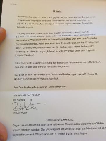 : Informationsfreiheitsgesetz: Leaken ist staatlich anerkannte öffentliche Zugänglichmachung netzpolitik.org leakt einen Brief und das Bundeskanzleramt erklärt daraufhin, dieser sei nun öffentlich zugänglich und es bestehe kein Anspruch mehr auf eine IFG Auskunft. Das bedeutet, öffentlich zugängliche Dokumente nach dem IFG, müssen nicht freiwillig veröffentlicht worden sein, sondern darunter fallen auch geleakte Dokumente. Dies ist ein Gastbeitrag von Malte Spitz, Mitglied im Landesvorstand von […]
