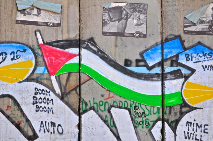 Palästinensische Flagge auf einem Graffiti in Bethlehem : Bürgerrechtler warnen vor stärkerer Überwachung der Palästinenser im Netz Neuer Bericht kritisiert hunderte Fälle von Festnahmen wegen Facebook-Einträgen und zeigt sich besorgt über verstärktes Vorgehen der Sicherheitskräfte auf Basis von Algorithmen.