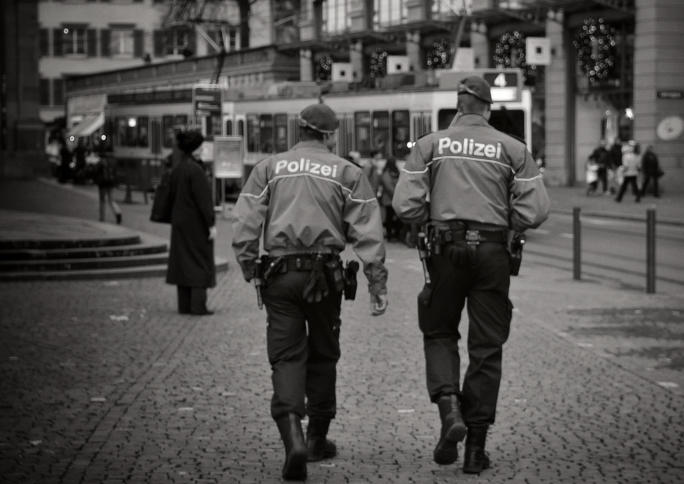 Zwei Polizisten auf Streife in der Zürcher Innenstadt. : Schweiz: Predictive Policing liegt meist falsch Eine Fehlerquote von zwei Dritteln: Die soll eine in der Schweiz eingesetzte Vorhersagesoftware liefern. Trotzdem nutzt sie die Polizei, um Personen als Gefährder zu klassifizieren.