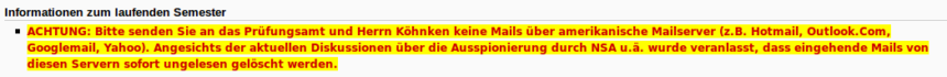 : Universität Kiel bietet Intelligenztest für angehende Psychologen Das Institut für Psychologie an der Universität Kiel hat eine ungewöhnliche Kommunikationsstrategie, um auf die Auswirkungen des NSA-Überwachungsskandals hinzuweisen. Auf der Webseite steht, dass man an das Prüfungsamt „keine Mails über amerikanische Mailserver (z.B. Hotmail, Outlook.Com, Googlemail, Yahoo)“ schicken sollte, da „eingehende Mails von diesen Servern sofort ungelesen gelöscht werden“. Ich bin noch etwas unschlüssig, […]