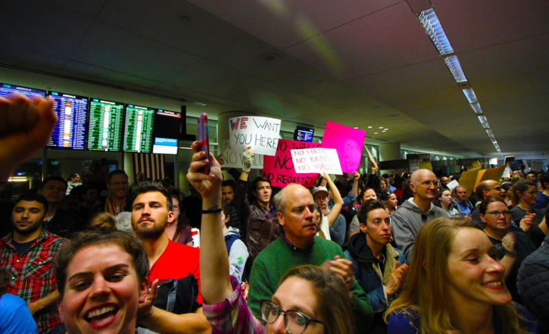 Proteste gegen den Muslim Ban am Flughafen in San Francisco. Foto: <a href="https://creativecommons.org/licenses/by-nc/2.0/">CC-BY-NC 2.0</a> <a href="https://www.flickr.com/photos/43005015@N06/32431796902/sizes/h/">rawEarth</a> : Große Internetkonzerne geschlossen gegen Trumps Einreisepolitik Donald Trumps radikales Einreiseverbot für Bürger bestimmter muslimischer Länder stößt auch bei den großen Internetkonzernen auf breiten Widerstand. Bei Google gab es sogar eine Demo der Mitarbeiter an acht Standorten.