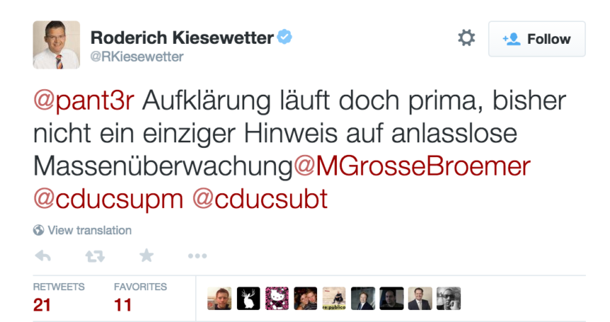 : Kiesewetter im Visier der BND-Vorfeldorganisation Nachdem die BND-Kontakte zu Reservisten durch die BND-Verstrickungen der Kiesewetter-Affäre (mp3) aktuell diskutiert werden, haben wir mal einen Blick auf die potentiellen BND-Zuträger geworfen, die den MdB Kiesewetter im Arbeitsalltag sonst noch umzingeln. Koalitionär SPD sowie Linke und Grüne möchten ja nun gern wissen, welche Kontakte es zwischen BND und Reservisten noch so gibt. Wir […]
