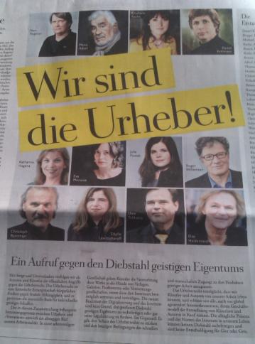 : Nochmal 100 Köpfe, diesmal in der Zeit Nach der Handelsblattkampagne „Mein Kopf gehört mir“ verwendet heute auch DIE ZEIT die Titelseite ihres Feuilletons für Kampagnenjournalismus zum Thema Urheberrecht. Und wieder werden 100 prominente Erstunterzeichner, unter denen sich Leute wie Sven Regener, Charlotte Roche und Roger Willemsen befinden, aufgelistet. Unter der Überschrift „Wir sind die Urheber“ findet sich die Unterzeile „Ein Aufruf gegen den […]