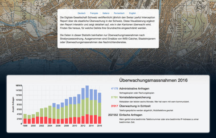 : Report: Telekommunikationsüberwachung in der Schweiz rückläufig Während die technischen Möglichkeiten und die Befugnisse für Überwachung in der Schweiz ständig erweitert werden, geht die Zahl der statistisch erfassten Überwachung zurück. Das geht aus dem jährlichen Bericht der Digitalen Gesellschaft Schweiz hervor.