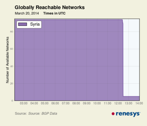 : Syrien ist offline [UPDATE] Google, Renesys, OpenDNS und andere bemerkten gestern Abend, dass es plötzlich keinen Datenverkehr mehr von und nach Syrien gab. Renesys confirms loss of Syrian Internet connectivity 18:43 UTC.BGP routes down, inbound traces failing.@geeknik — Renesys Corporation (@renesys) May 7, 2013 Im November 2012 hatte es bereits einen zweitägigen Blackout gegeben, und beide Seiten des Bürgerkriegs […]