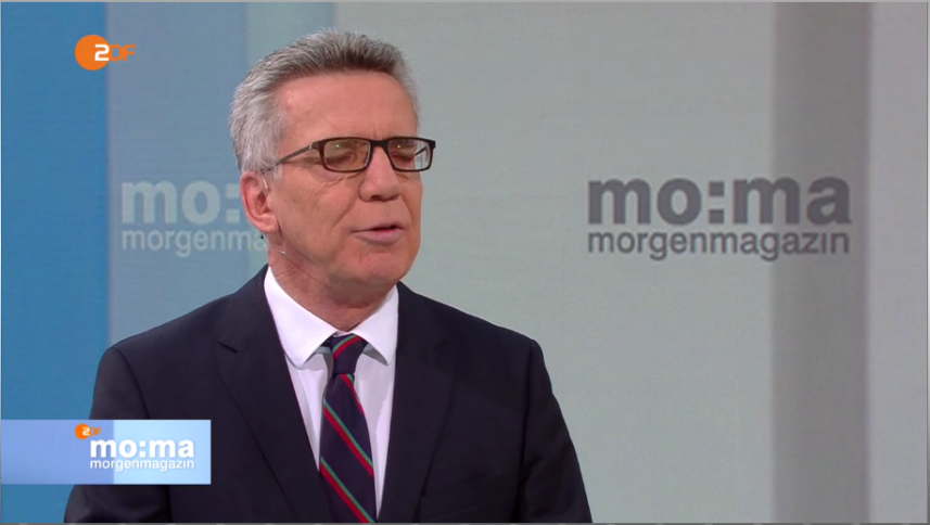 Thomas de Maiziere im ZDF-Morgenmagazin (C) ZDF : Thomas de Maizière wirbt für Verschärfung der Providerhaftung (Update) Innenminister de Maizière forderte im ZDF-Morgenmagazin eine Providerhaftung, die bereits Gesetz ist. Man muss die Aussage aber im Rahmen der EU-Terrorismus-Richtlinie sehen, wo derzeit Netzsperren und eine Privatisierung der Rechtsdurchsetzung durch intransparente „Selbstregulation“ der Provider diskutiert werden.