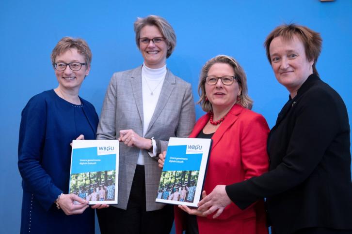 Von links nach rechts: Sabine Schlacke vom WBGU, Bildungsministerin Anja Karliczek (CDU), Umweltministerin Svenja Schulze (SPD) und Ina Schieferdecker (WBGU) heute in der Bundespressekonferenz. Umweltgutachten: Digitalisierung ist heute Brandbeschleuniger für Ressourcen-Raubbau und Ungleichheit Die Digitalisierung, wie wir sie heute kennen, untergräbt den Klimaschutz und Grundrechte. Der Umweltbeirat der Bundesregierung macht Vorschläge, das zu ändern – vor allem auf der internationalen Ebene. Aber wie glaubwürdig wäre die Bundesregierung, wenn sie bei EU und UN nachhaltige Digitalisierung fordert, aber zu Hause wenig Fortschritte macht?