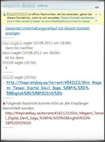 : Microsofts Messenger blockiert Piratebay-URLs Wie Torrentfreak am Samstag berichtete, blockiert Microsofts Instant-Messanging-Programm „Windows Live Messenger“ sämtliche URLs, die auf die schwedische BitTorrent-Suchmaschine „The Pirate Bay“ verweisen. Ein Grund, warum die Nachricht nicht übermittelt werden kann, wird nicht genannt. Es steht allerdings zu vermuten, dass im Zuge der „freiwilligen Kooperation“ zwischen Urheberrechts-Verwertern und Internet-Diensteanbietern, die unter anderem vom umstrittenen ACTA-Abkommen […]