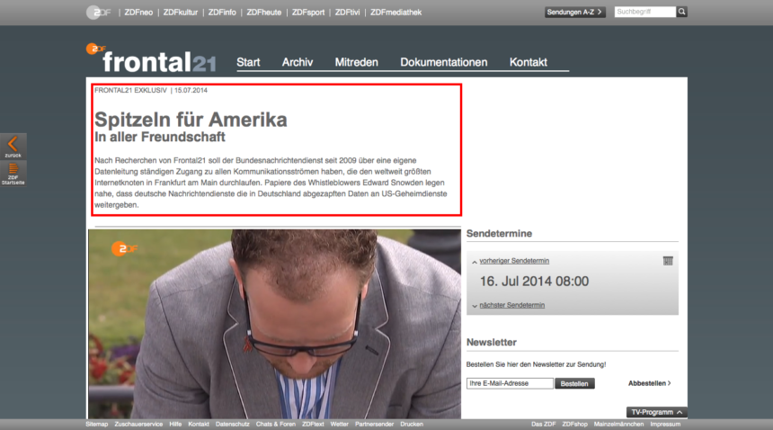 : Frontal21 exklusiv: Spitzeln für Amerika (Update) Heute hat Frontal21 im ZDF exklusiv über neue Erkenntnisse zu der Netzüberwachung des Bundesnachrichtendienstes berichten wollen. Wir hatten uns im Vorfeld schon gewundert, dass der Vorab-Beitrag trotz Exklusiv-Hinweis keine relevanten neuen Informationen enthielt. Der TV-Beitrag selbst schaffte es nicht, neue Erkenntnisse zu liefern. Nicht mal die Information ist neu, dass der Bundesnachrichtendienst auf deutsche Gesetzgebung […]